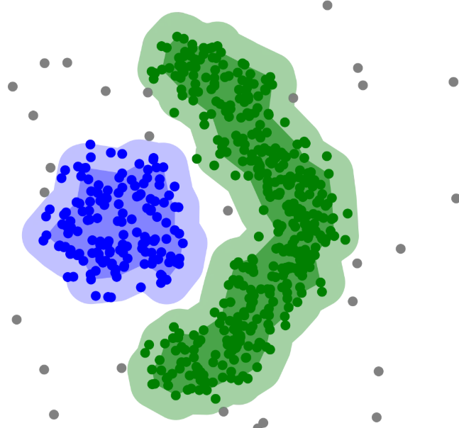 : k를 미리 설정하지 않아도 되며, 노이즈 포인트(어느 군집에도 속하지 않는 점)을 구분할 수 있음