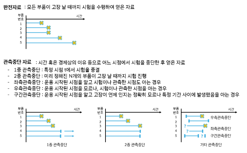 - 완전 고장데이터를 이용해 수명분포함수(F(t))와 신뢰도 함수(R(t))를 표현 가능
