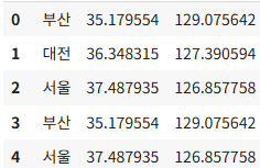 그리고 지역별 경도와 위도를 뽑아보도록 하겠습니다.