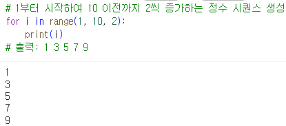 # 1부터 시작하여 10 이전까지 2씩 증가하는 정수 시퀀스 생성