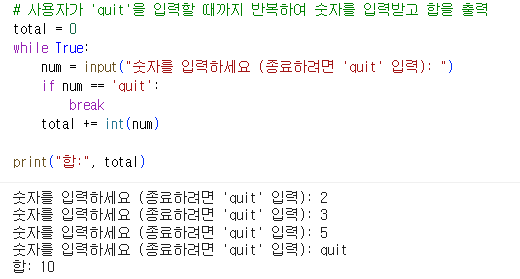 이런식으로 quit을 입력할때까지 루프가 계속되어 quit을 눌러야 루프가 끝나는 것을 볼 수 있습니다.