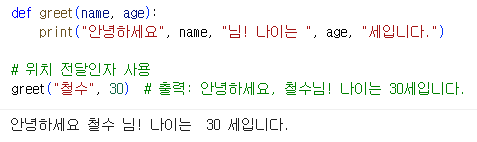 | *args | 함수를 호출할때 임의의 개수의 위치 인수를 전달합니다. |