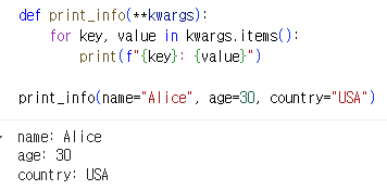 | *kwargs | 함수를 호출할 때 임의의 개수의 키워드 인수를 전달합니다. |
