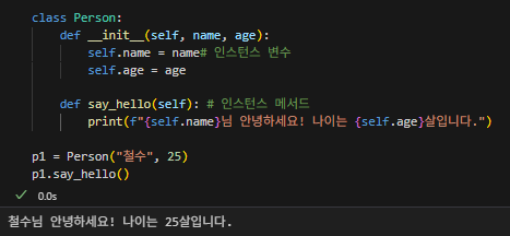 - __init__ 내부 코드가 실행되어, 새로 만들어진 객체(p1)는 name이라는 속성에 "철수"를, age라는 속성에 25를 가지게 됩니다.