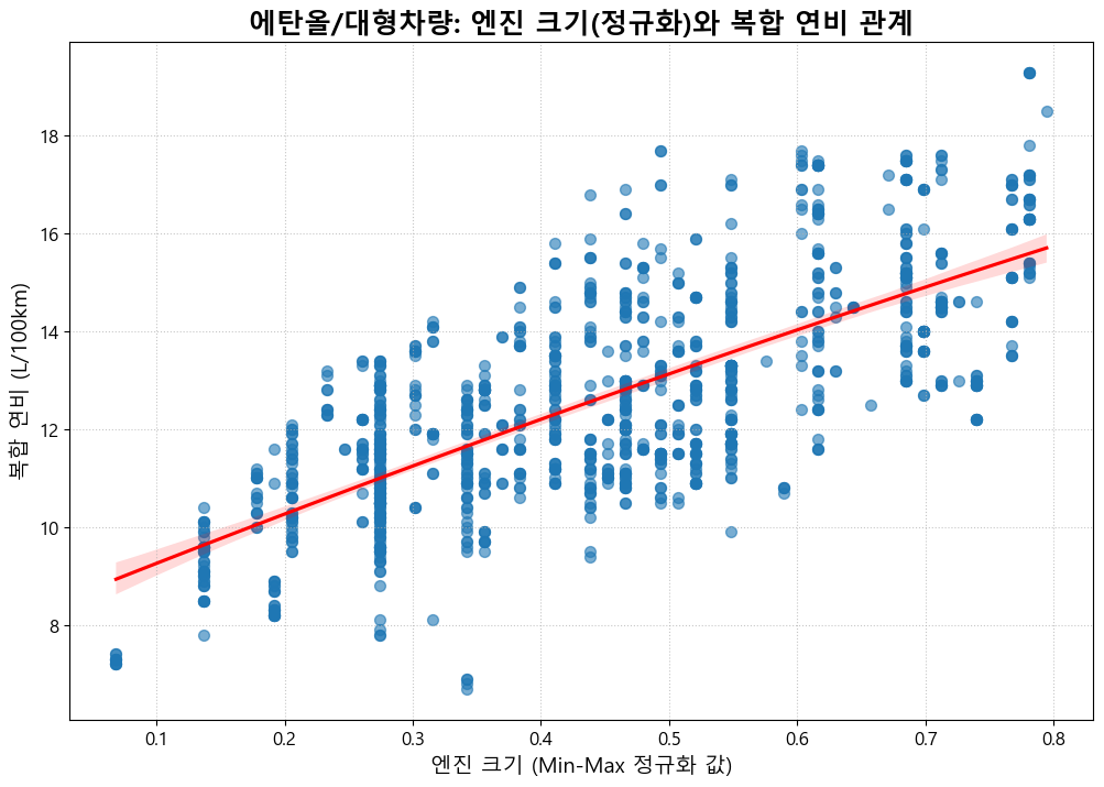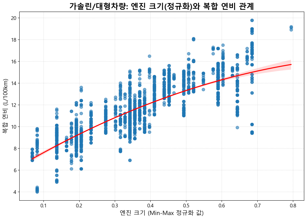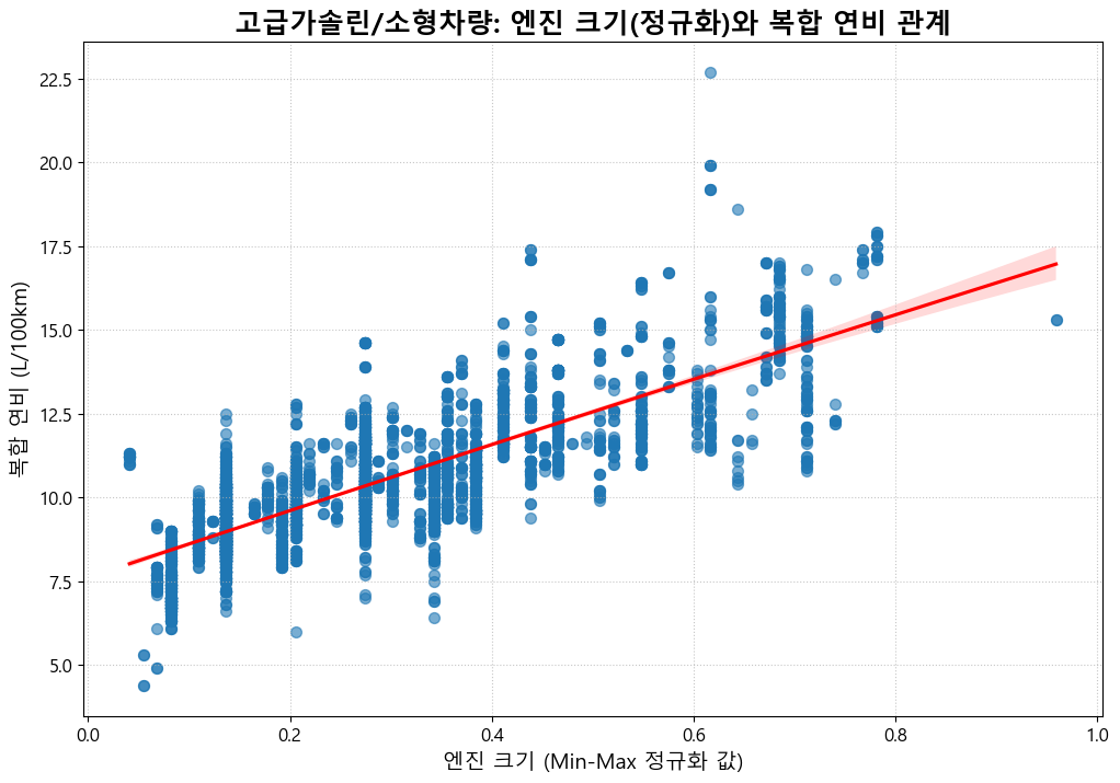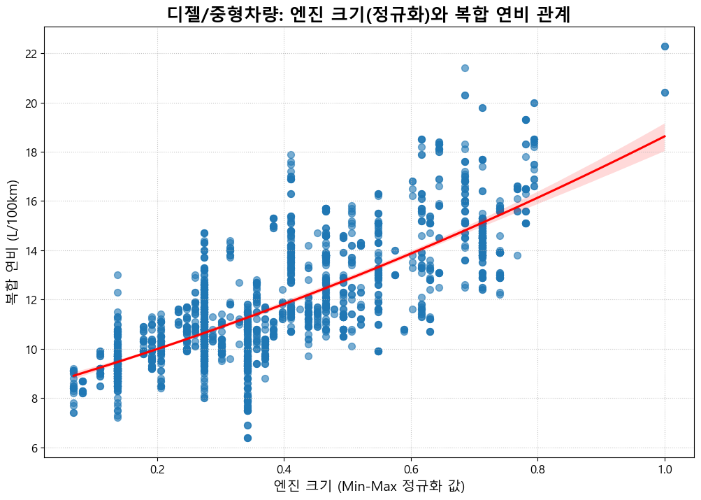 plt.xlabel('엔진 크기 (Min-Max 정규화 값)', fontsize=14)
