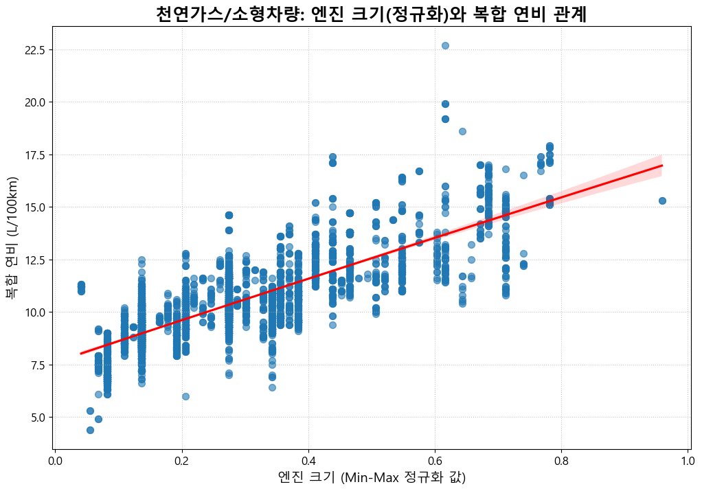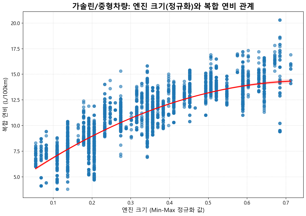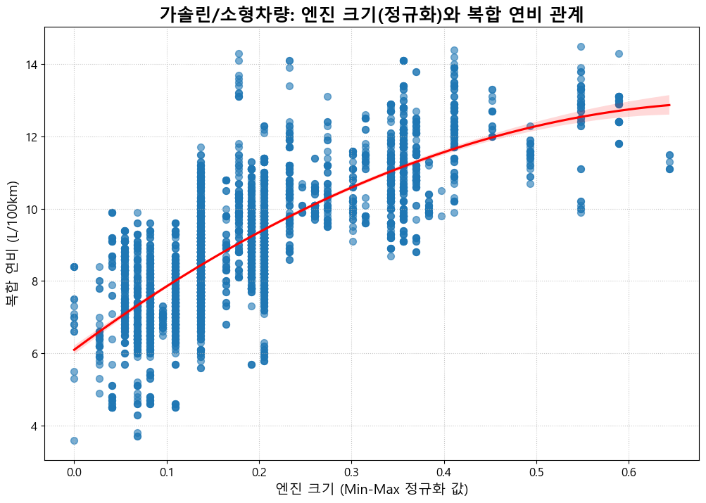 plt.title('가솔린/소형차량: 엔진 크기(정규화)와 복합 연비 관계', fontsize=18, fontweight='bold')