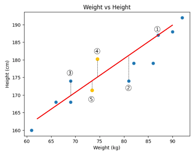 다음과 같은 1차 회귀 식에서 (오차제곱/데이터의 수)의 합이 가장 적은 선을 선형회귀 식이라고 한다.