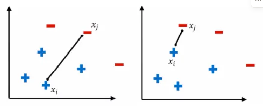 다른 클래스의 데이터 두 개를 연결했을 때 주변에 다른 임의의 데이터 Xk가 존재할 때