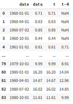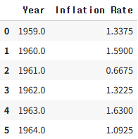 y_t = inflation_rate_yearly_avg['Inflation Rate'][:-lag].reset_index(drop=True)