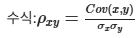 - 공분산은 데이터의 단위(cm, m 등)에 따라 값이 달라지므로, 이를 표준화하여 -1과 1 사이의 값으로 바꿉니다