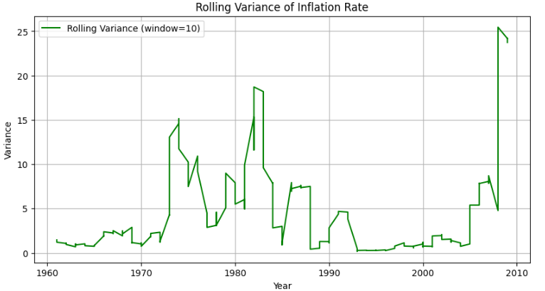inflation_rate_df['Rolling Variance'] = inflation_rate_df['Inflation Rate'].rolling(window=window_size).var()
