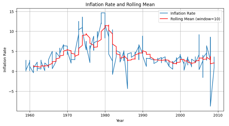inflation_rate_df['Rolling Mean'] = inflation_rate_df['Inflation Rate'].rolling(window=window_size).mean()