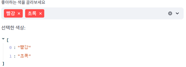 colors = st.multiselect("좋아하는 색을 골라보세요", ["빨강", "파랑", "초록", "노랑"], ["빨강"])