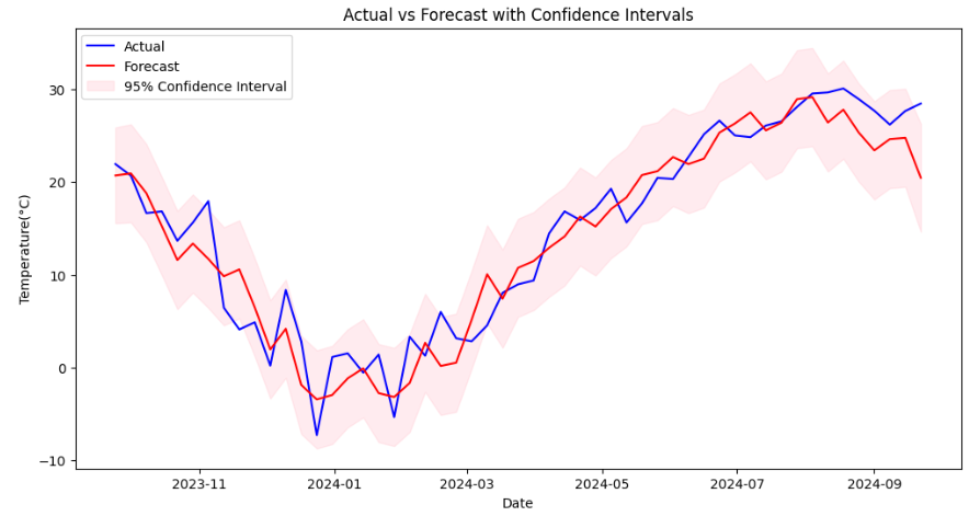 성능 지표를 비교해 보면, Prophet 모형의 MSE와 RMSE가 눈에 띄게 개선된 것을 확인할 수 있습니다. Prophet은 계절성과 추세를 자동으로 분리하는 특징이 있어, 비선형적이거나 복잡한 패턴을 가진 시계열 데이터를 처리하는 데 강점을 보입니다. 특히, 이번 주간 평균 기온 데이터에서 Prophet이 상대적으로 더 나은 예측 성능을 보여주는 이유는, 계절성 패턴을 효과적으로 반영하면서도, 특정 변화점을 잘 감지했기 때문입니다.