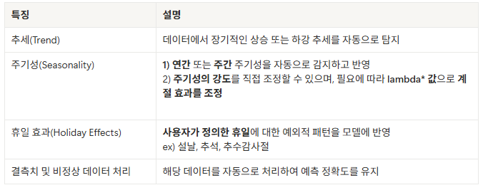 Prophet은 Meta(구 Facebook)에서 개발한 시계열 예측 모델로, 추세(Trend), 계절성(Seasonality), 휴일 효과(Holiday Effects) 등을 고려하여 유연하고 강력한 모델링을 제공합니다. 특히 결측치 처리와 비정상적 데이터에 강하며, 대규모 데이터에서도 빠르게 작동하는 특성이 있습니다.