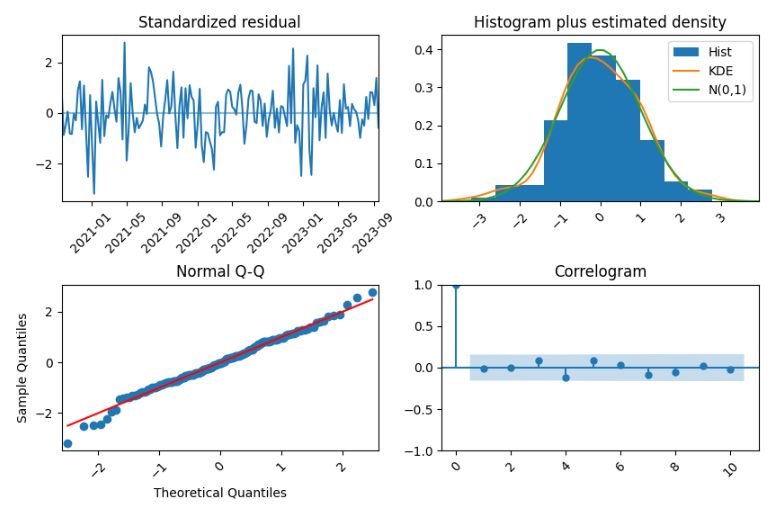 현재 Ljung-Box 테스트 결과에서 p-value가 0.05보다 큽니다.(0.4) 따라서 모델의 잔차가 무작위(백색소음)임을 알 수 있습니다