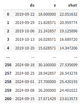 merged_data = pd.merge(ts[['ds', 'y']], forecast[['ds', 'yhat']], on='ds', how='inner')