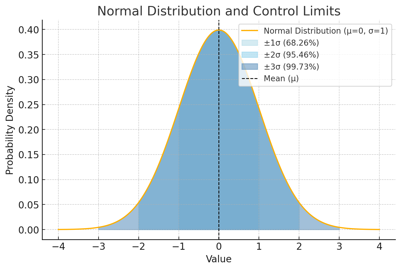공정 내 변동이 ±3σ(3 시그마) 이내라면 99.73%의 데이터가 허용된 범위 내 존재하여 정상적인 공정으로 볼 수 있다 반대로, 3σ를 넘어가는 값이 많아지면 공정이 이상 상태일 가능성이 높아지고, 개선이 필요함을 의미한다.