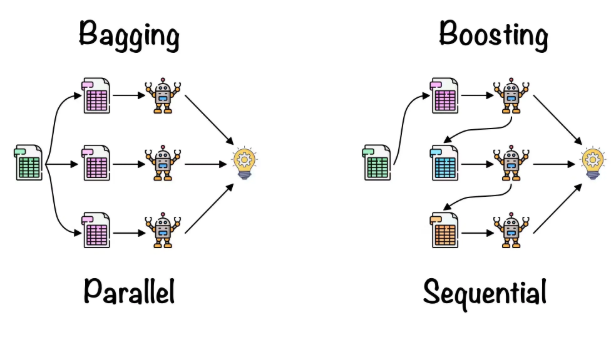 A1: 배깅은 여러 모델을 ‘병렬적으로’ 독립 학습시킨 뒤 결과를 결합(평균/투표)하는 방식이고, 부스팅은 모델을 ‘순차적으로’ 학습하면서 이전 모델의 오류를 단계적으로 보정해 나가는 방식입니다.