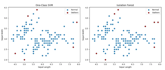 - 2개의 서브플롯을 만들어, 하나는 One-Class SVM 결과, 다른 하나는 Isolation Forest 결과를 표시합니다.