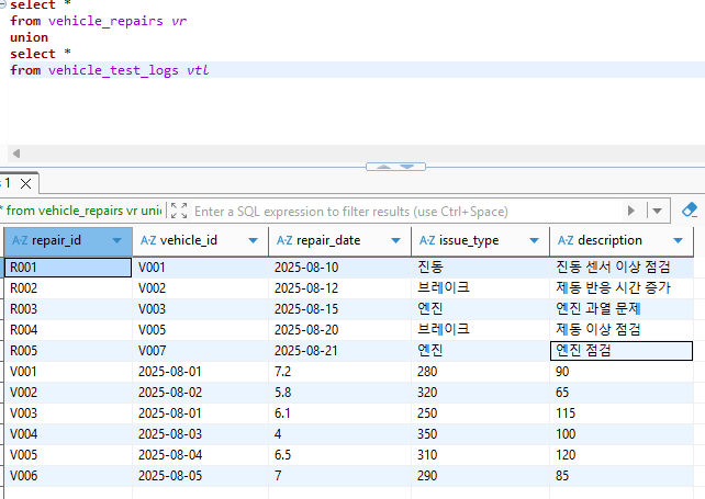 Join의 경우 새로운 열이 생성되지만 union의 경우 행을 차례대로 생성하여 보여줍니다.