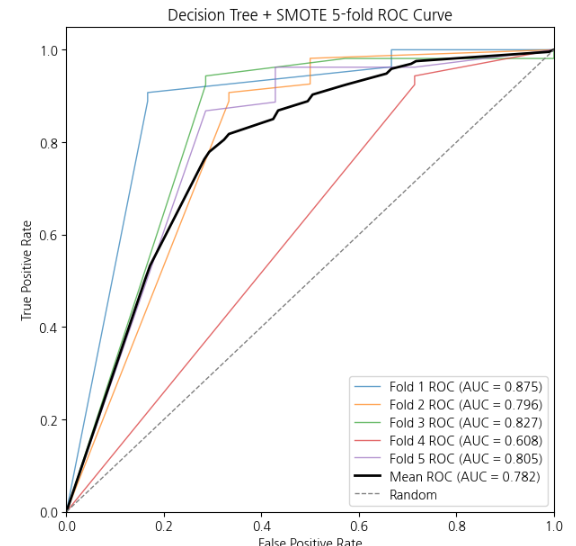 # 5-fold ROC curve & AUC 계산 (LightGBM + SMOTE)