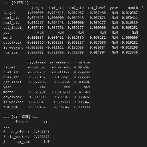 # 8) 다중공선성 확인 (상관관계, VIF)